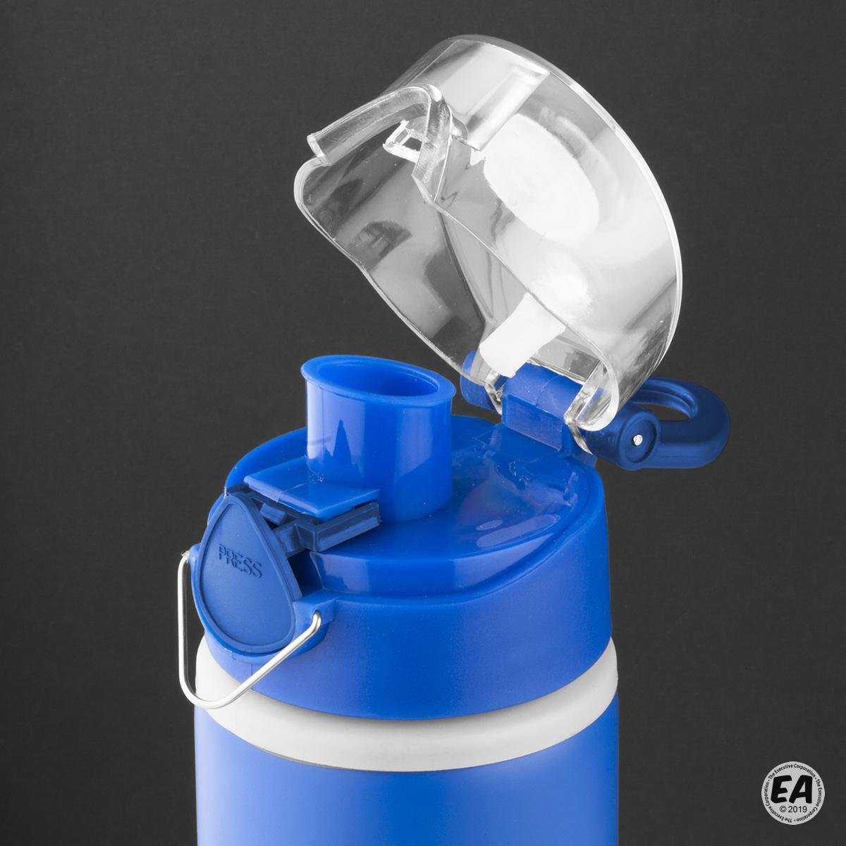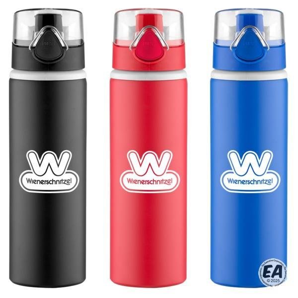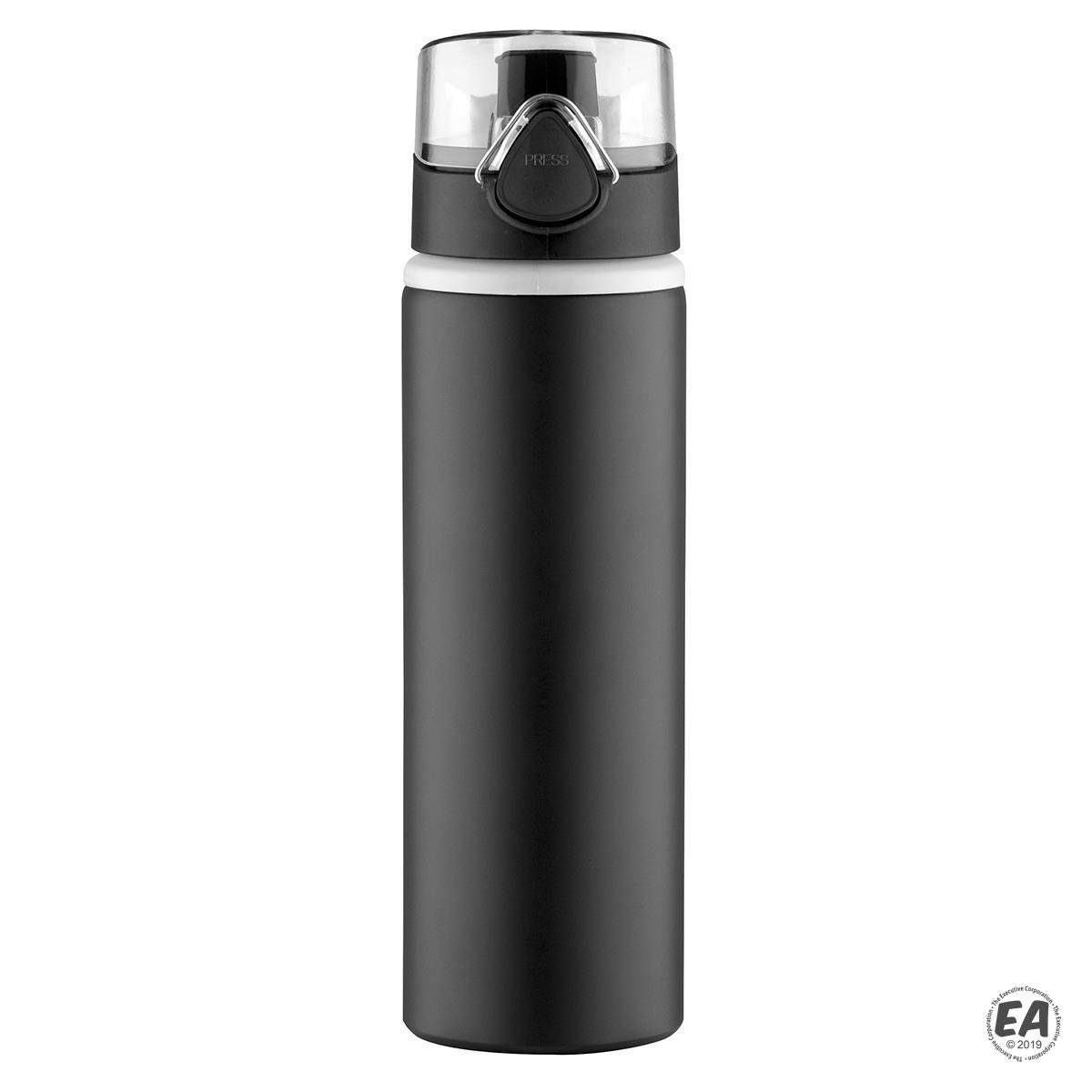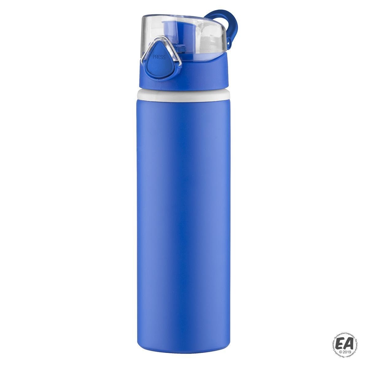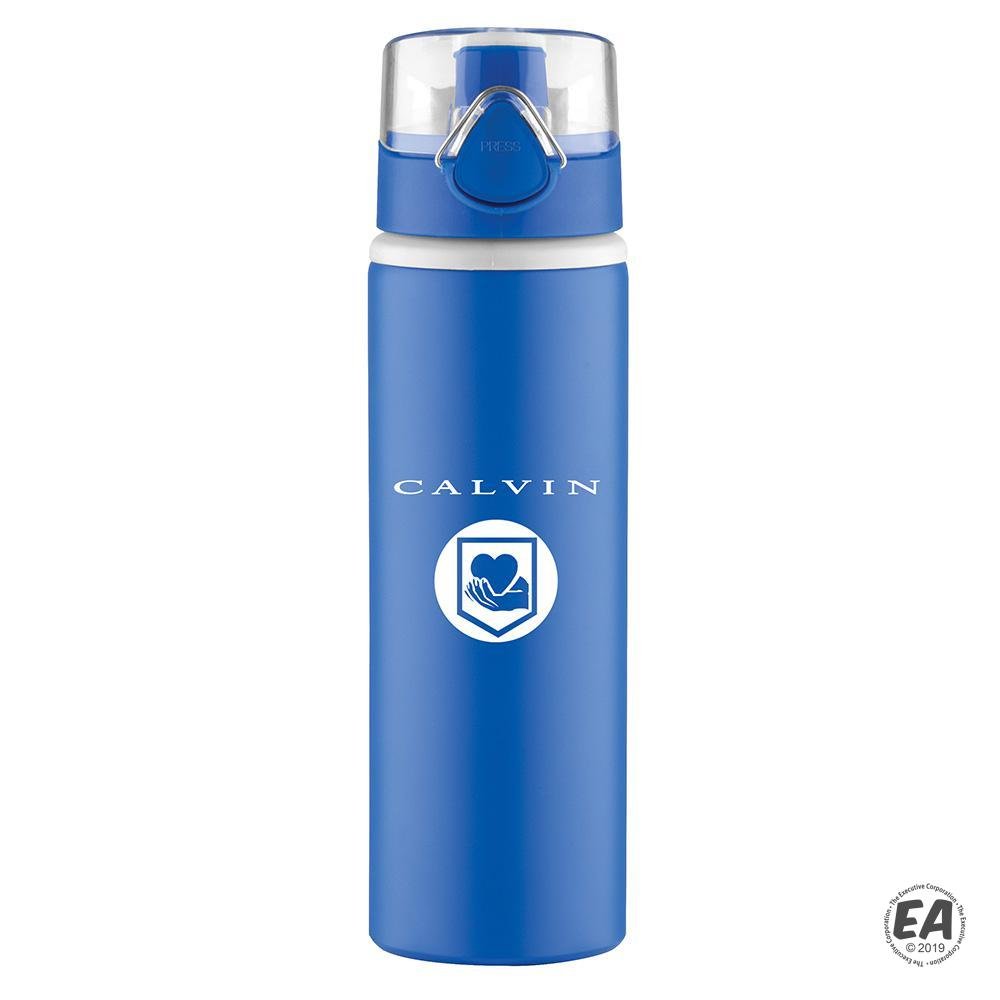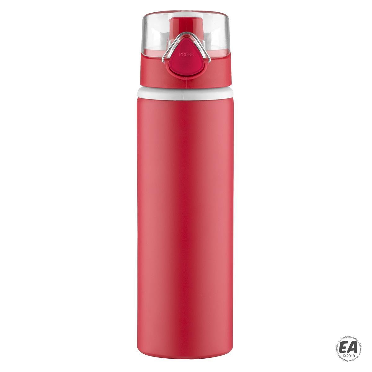 27 oz. Aluminum water bottle; bold color matte finish with light gray plastic lip accent. Matching color plastic press-n-flip cap with acrylic clear lid with attached carry loop. Not microwave safe; hand wash only.