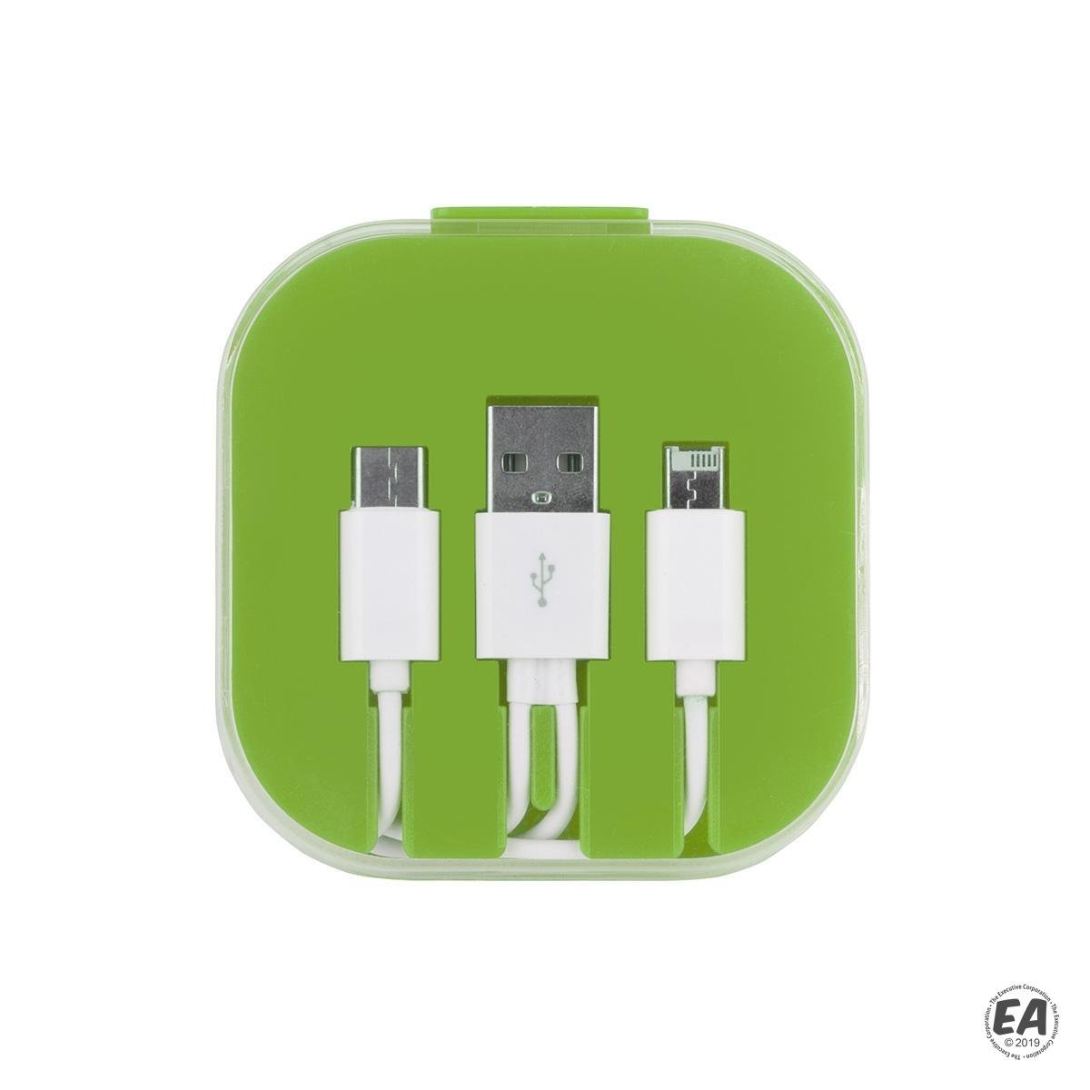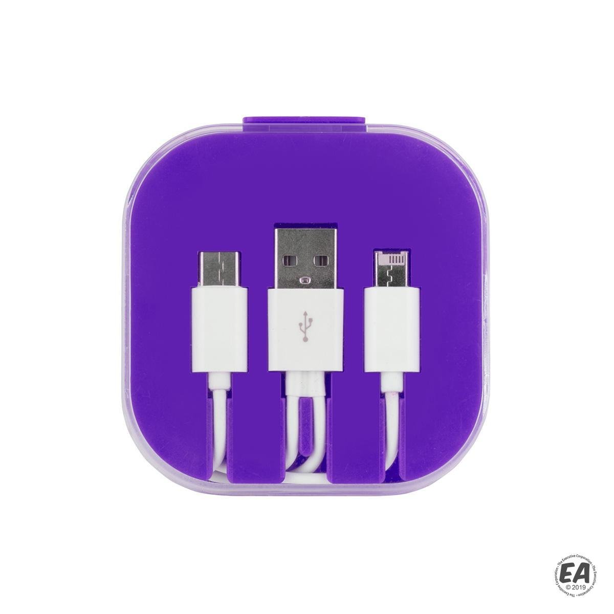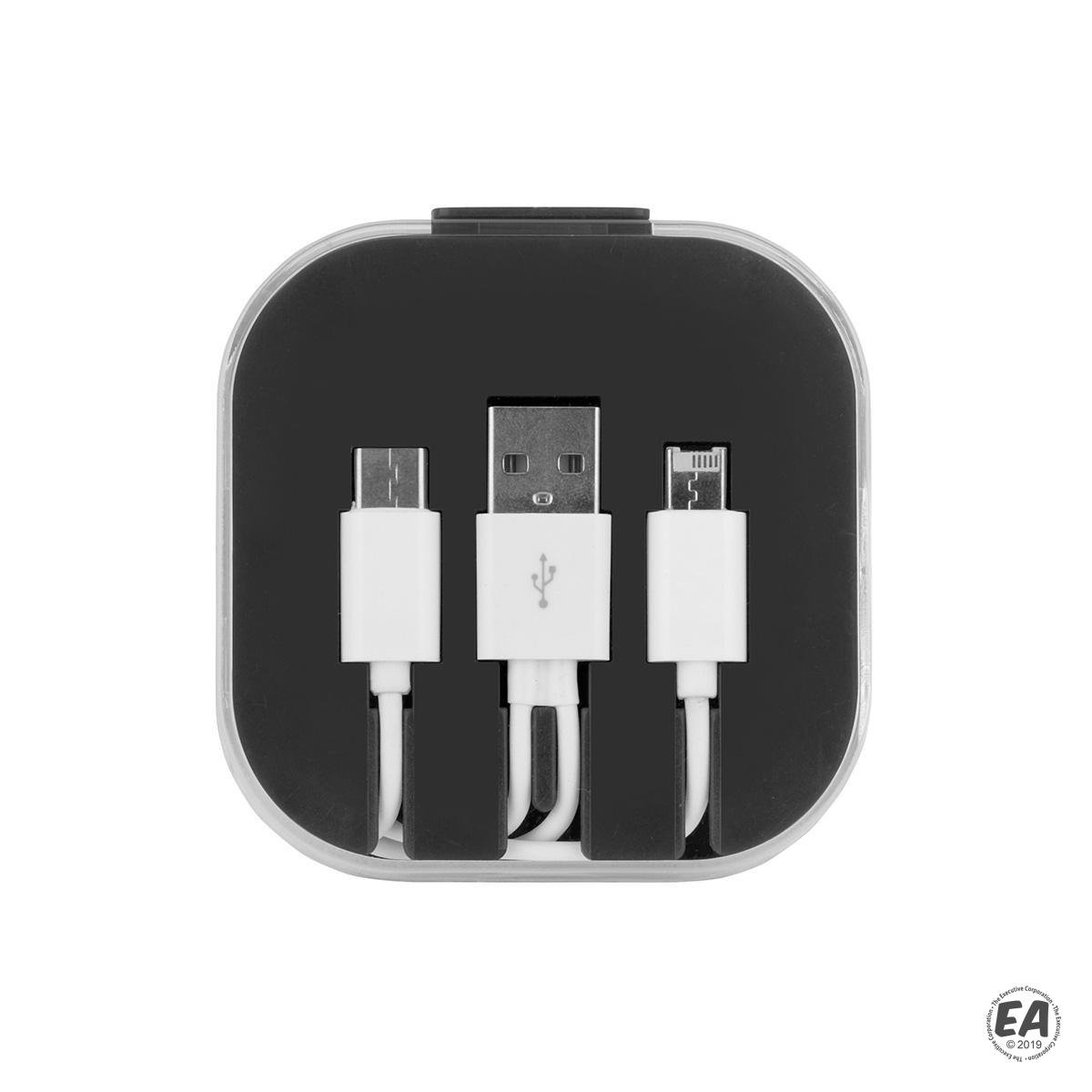 3-piece charging cable set with phone stand. Type-C and micro USB/lightning split cable; phone holder; carrying case.