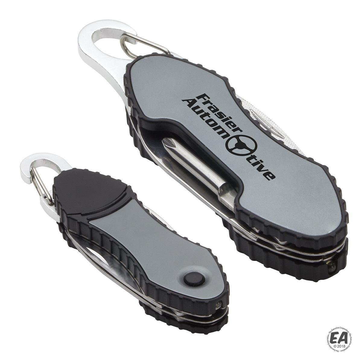 Features: This handy tool contains a host of features: – knife blade – saw – nail file with flat blade screwdriver – phillips screwdriver – carabiner clip Size: 4-1/2" x 1-1/4" x 5/8" Price Note: 1-Color, 1-Location Imprint Included. Set-Up Additional