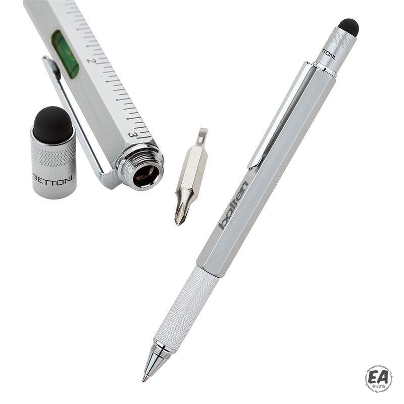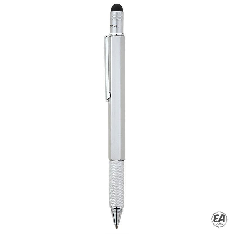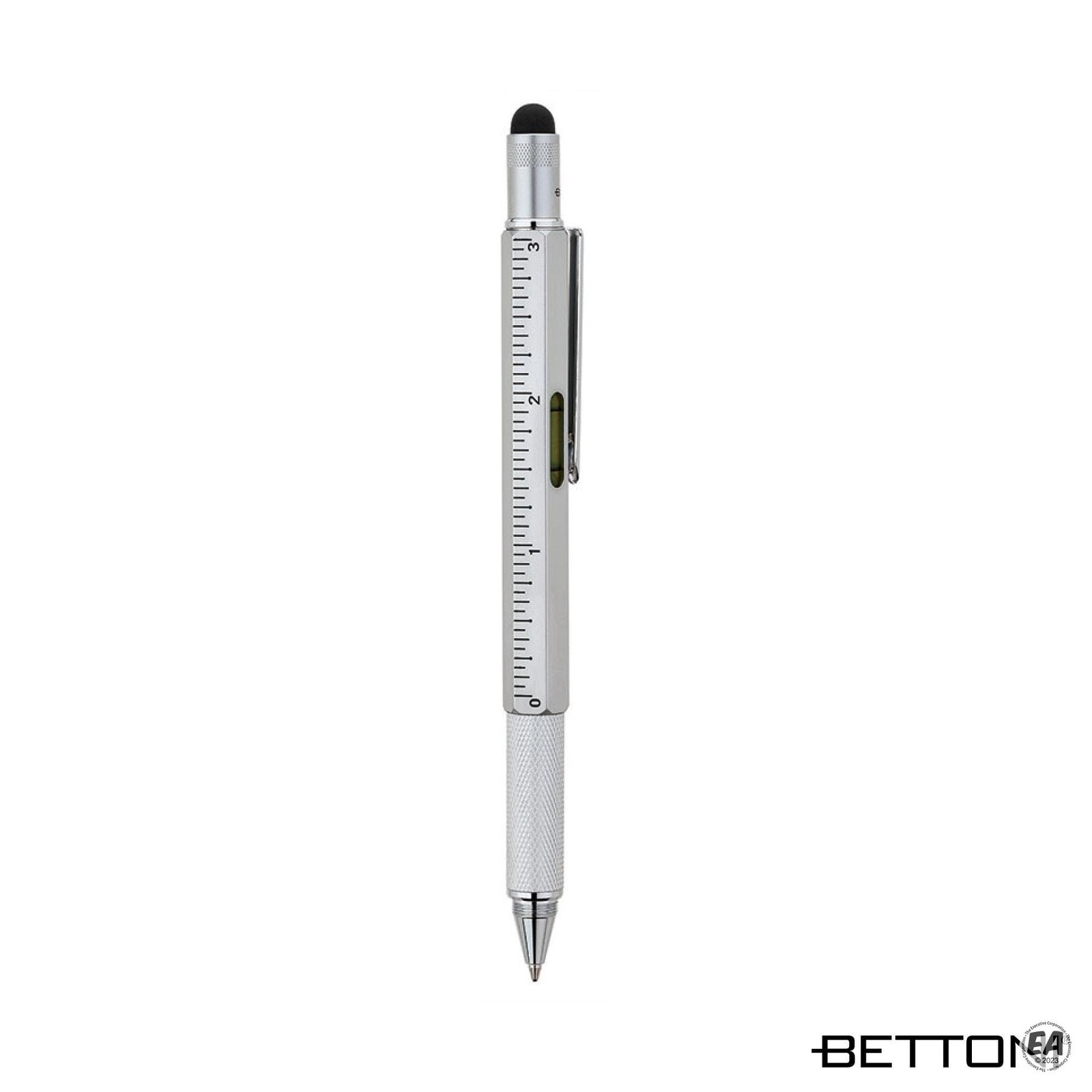 Twist-action ballpoint with textured metal grip, spirit level, 3" ruler, small Phillips and flathead screwdriver and a capacitive stylus that works with touch screen devices.