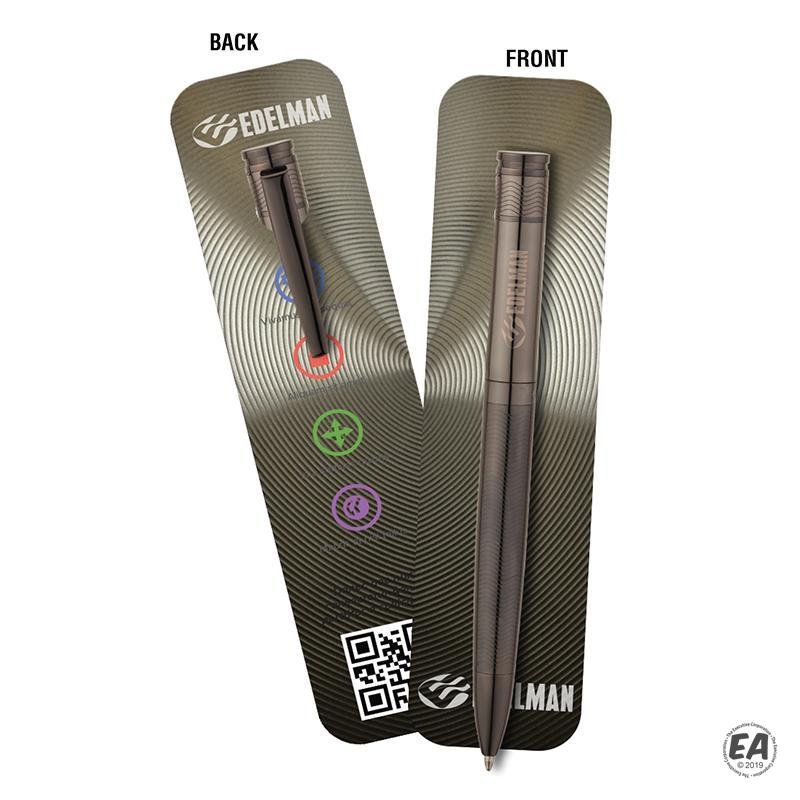 The Bettoni Abbracci brass ballpoint pen has a twist-action mechanism, gunmetal plating with high-gloss lacquer finish, USA-made ballpoint refill, and etched ridges that make it a pleasure to hold.