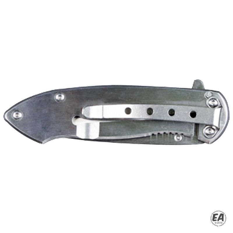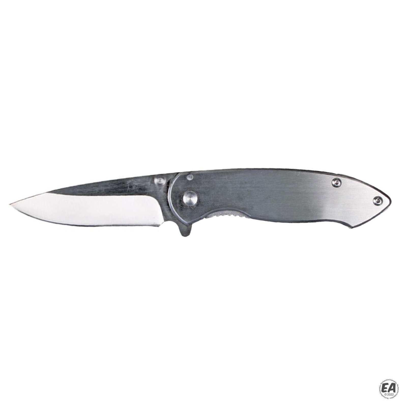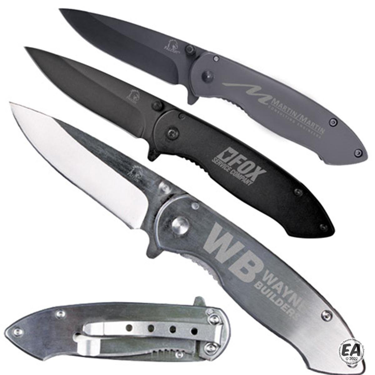 440 stainless steel blade with liner lock construction. Smooth metal handle with large area for decoration. Pocket clip. Falcon brand logo on blade. Laser recommended.
