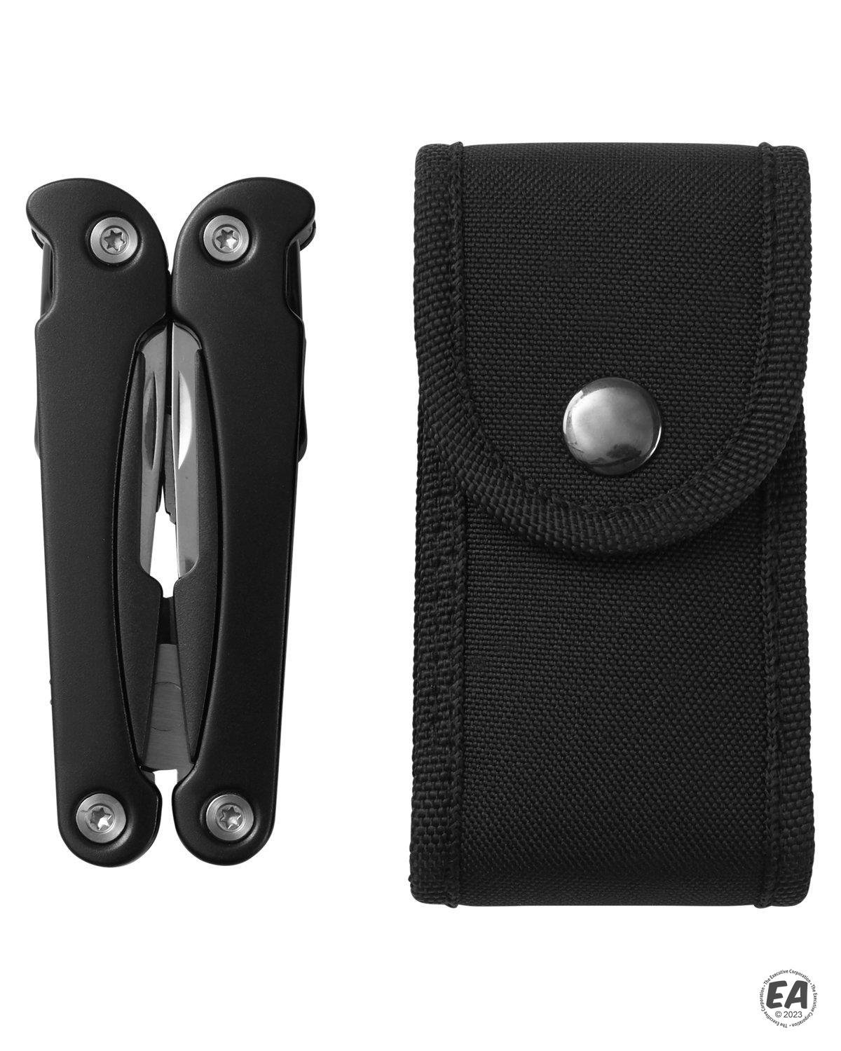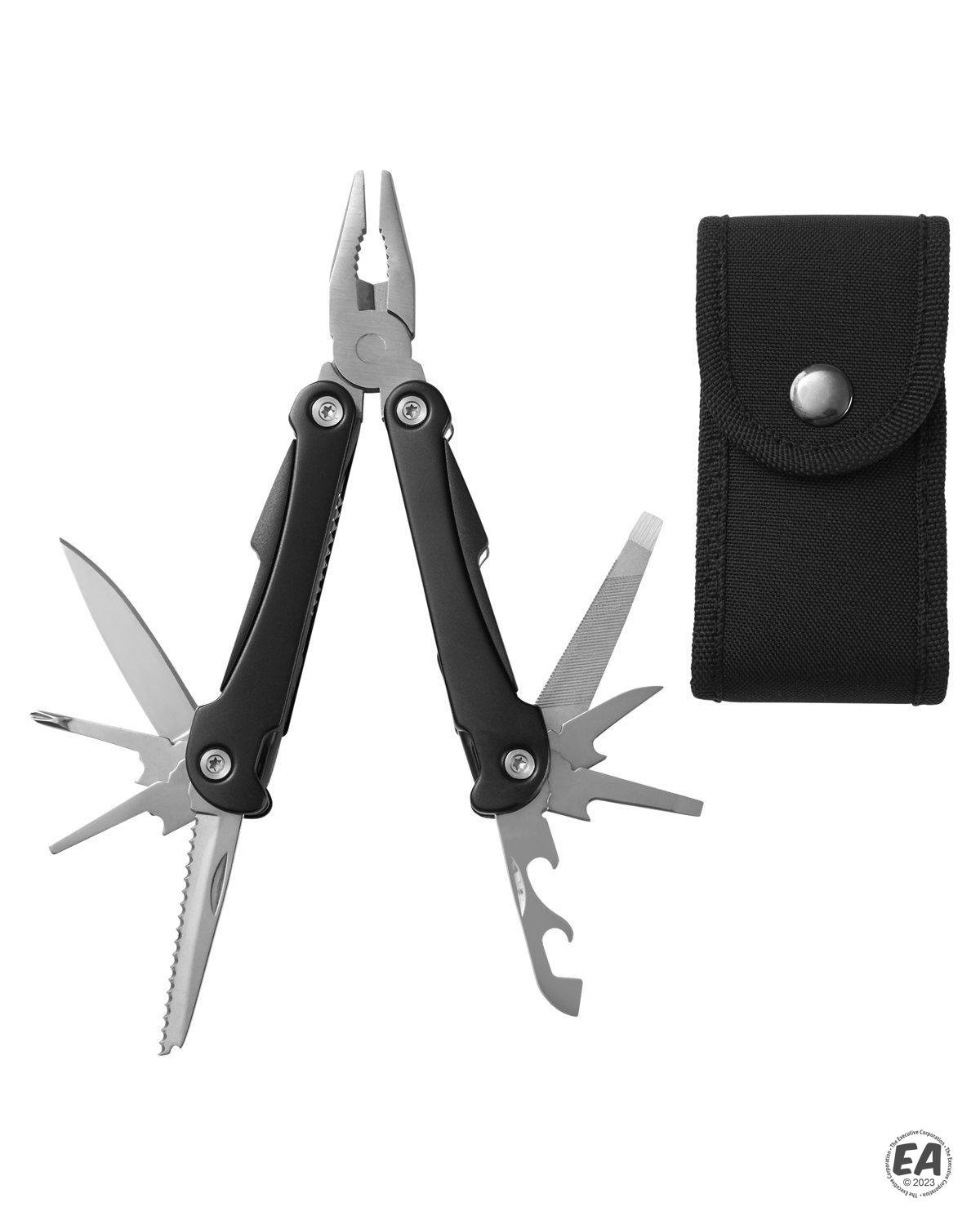 Multi-function multi-tool (needle nose pliers, pipe grip, wire cutter, flat screwdriver in three-sizes, Phillips screwdriver, double-sided file, scraper, can opener, bottle opener, knife and serrated knife)