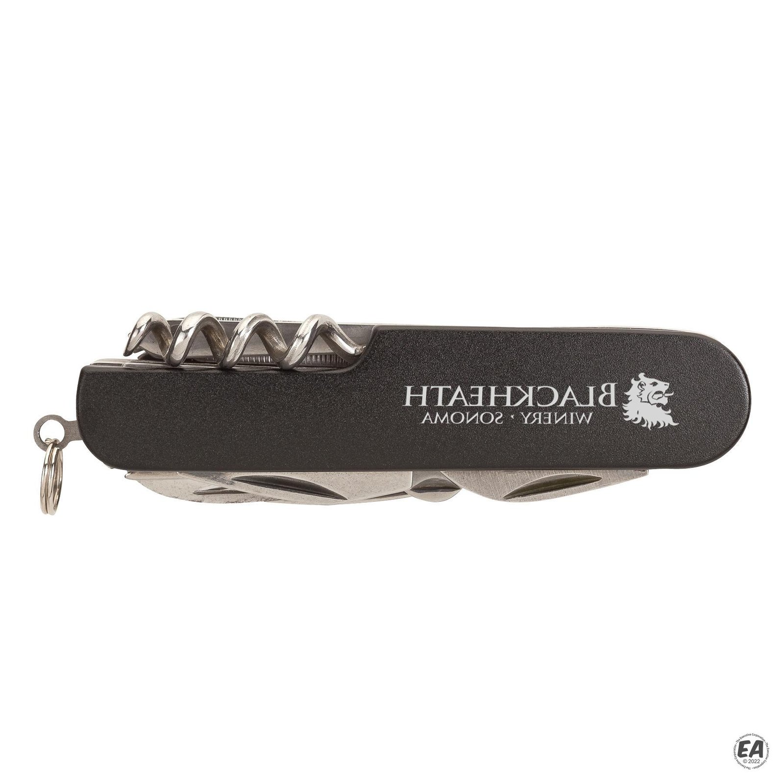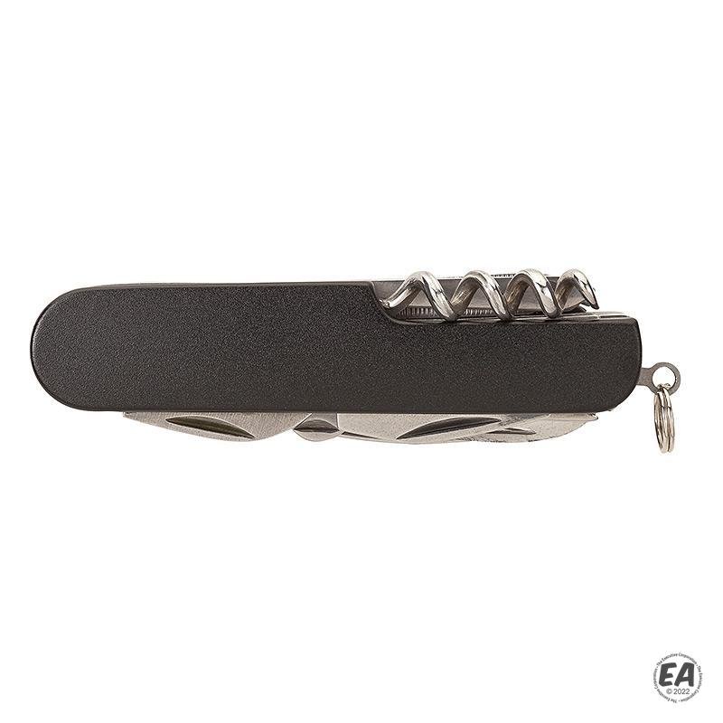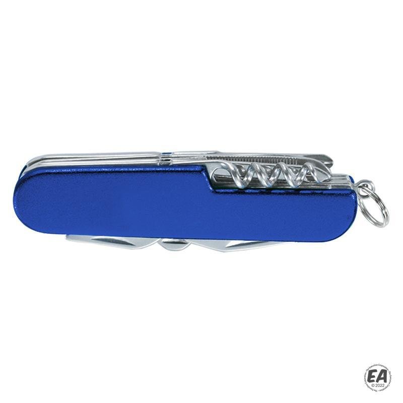 Knife, scissors, bottle opener, can opener, Phillips screwdriver, flathead screwdriver, nail file, corkscrew, punch, split ring, stainless steel construction, anodized aluminum handle.