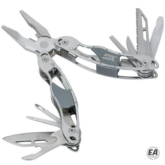 Includes pliers, wire cutters, small/medium/large screwdrivers, Phillips screwdriver, small and large straight blades, saw blade, fish scaler, hook remover, bottle opener, can opener and nail file
