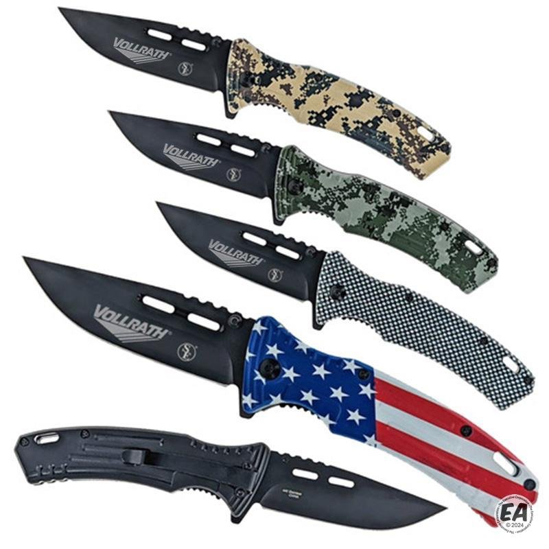 440 stainless steel drop point blade. ABS durable plastic lightweight handle with metal frame. Lightening wholes on blade. Seatbelt cutter and glass breaker tip. Pocket clip. Spring assisted & liner lock system. SE brand logo on blade. Decoration by laser (on blade) only.