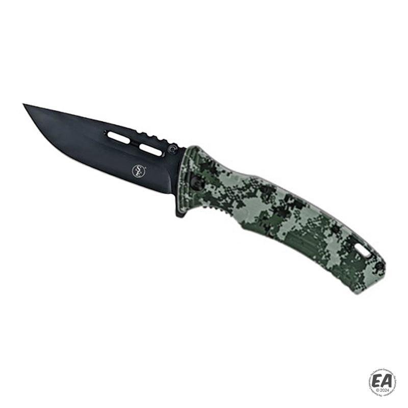 440 stainless steel drop point blade. ABS durable plastic lightweight handle with metal frame. Lightening wholes on blade. Pocket clip on back of handle. Spring assisted & liner lock system. SE brand logo on blade. Decoration by laser (on blade) only.