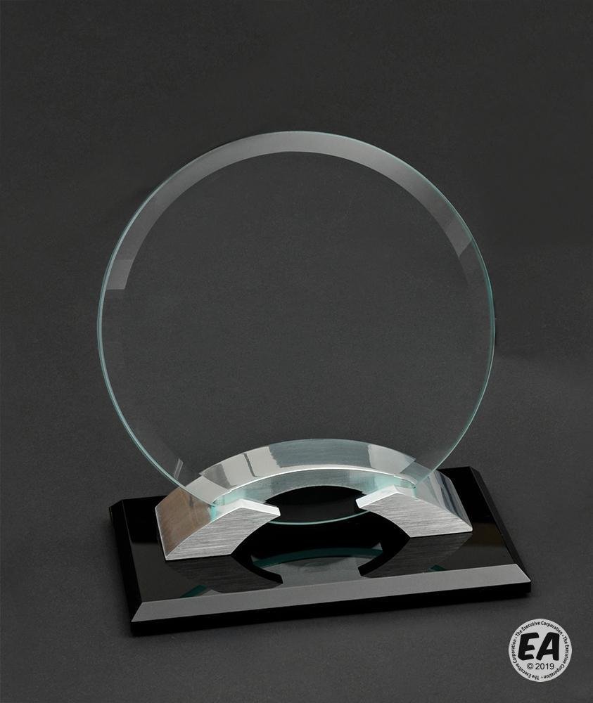 The Tangent Awards feature a unique arched designed base with a metal holder.
