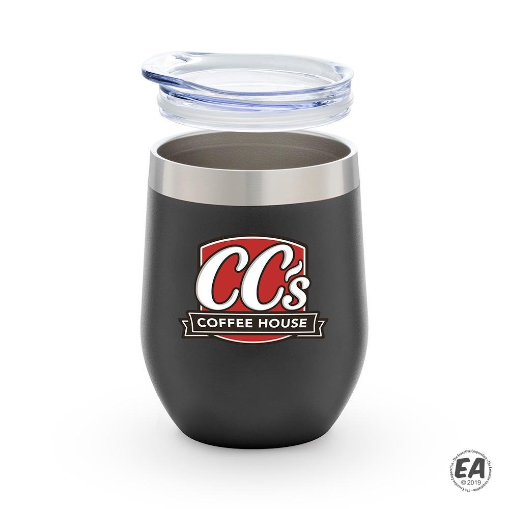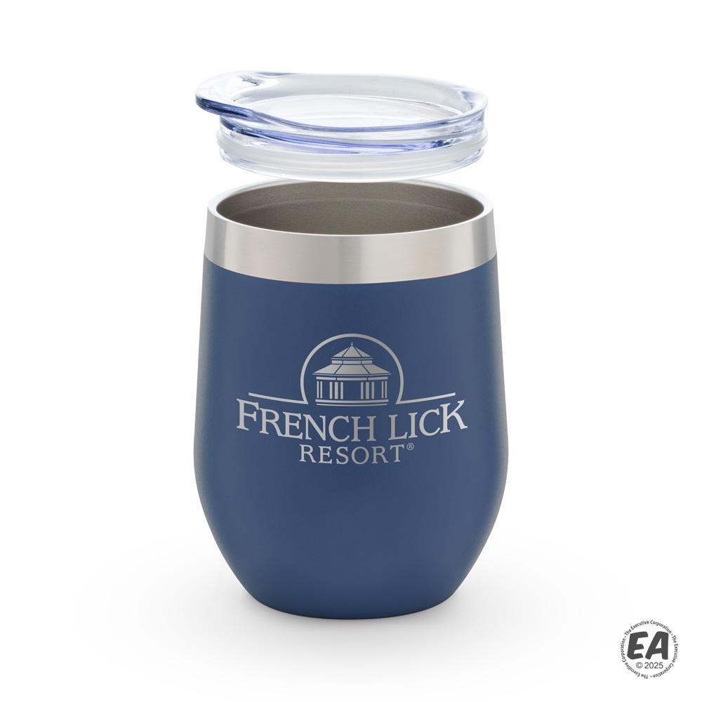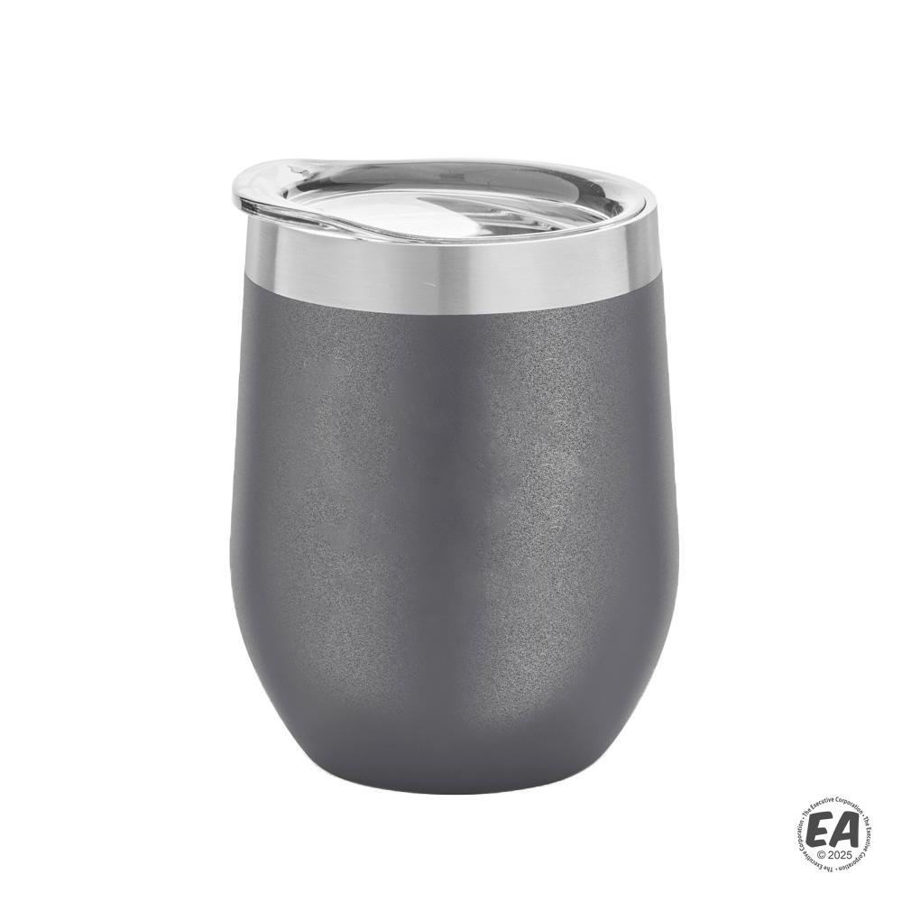 12 oz. Vacuum insulated double wall stemless wine tumbler with clear AS pressure lid. 18/8 Stainless Steel with copper lining. Not microwave safe; hand wash only. Packaged in retail box (4-3/4" L X 3-7/10" W X 3-7/10" D).
