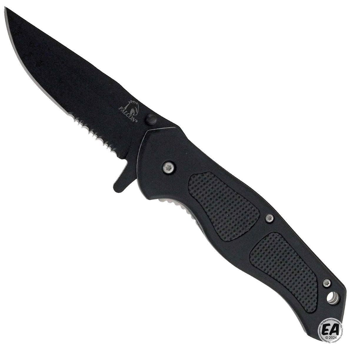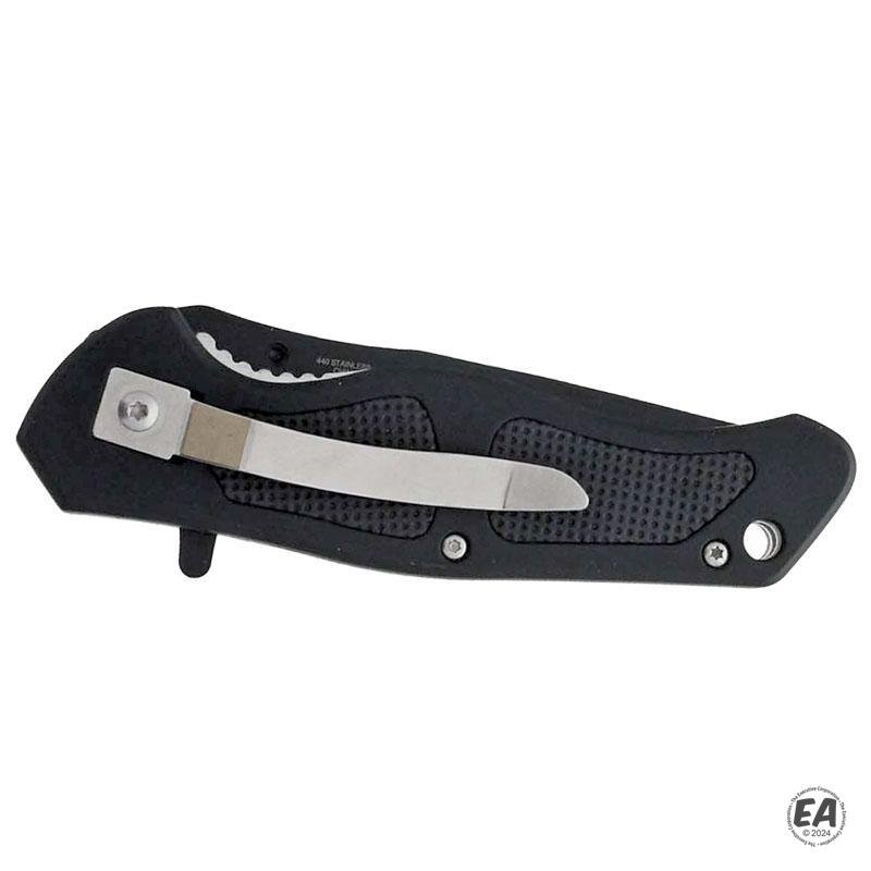 440 stainless steel partially serrated blade. Spring assisted system.Solid plastic handle with black rubber grip inserts. Pocket clip on backside. Laser only.