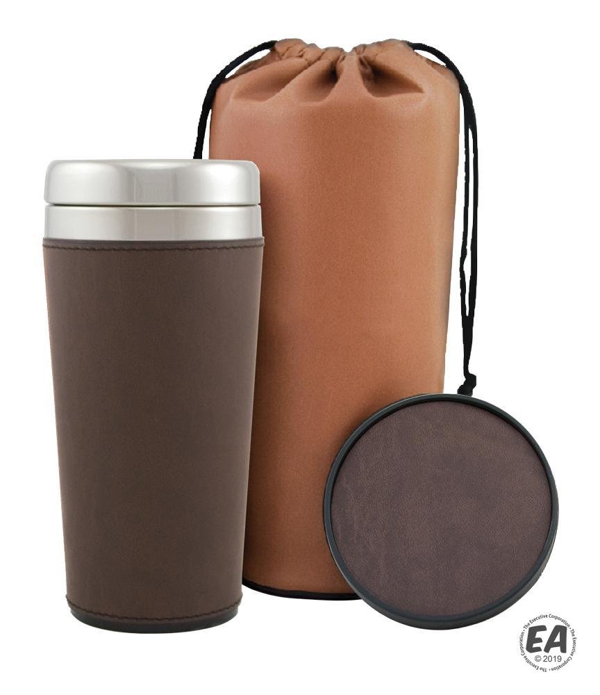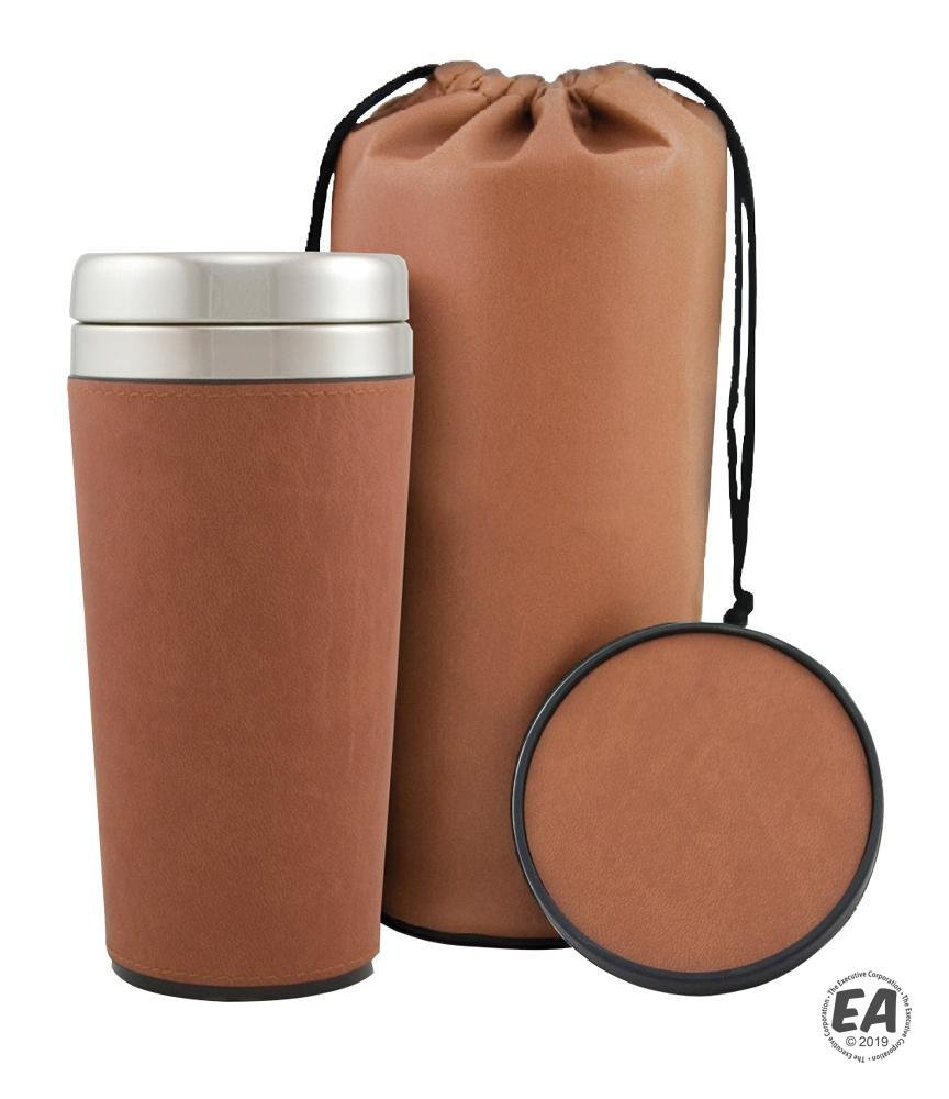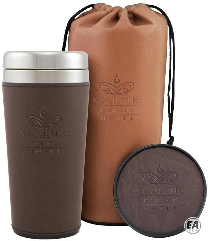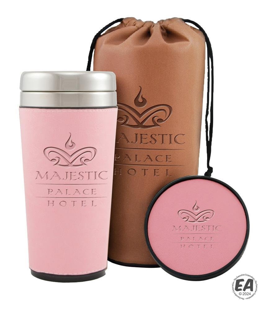 Gift set includes a debossed bag, coaster, and tumbler sleeve with the same debossed imprint.