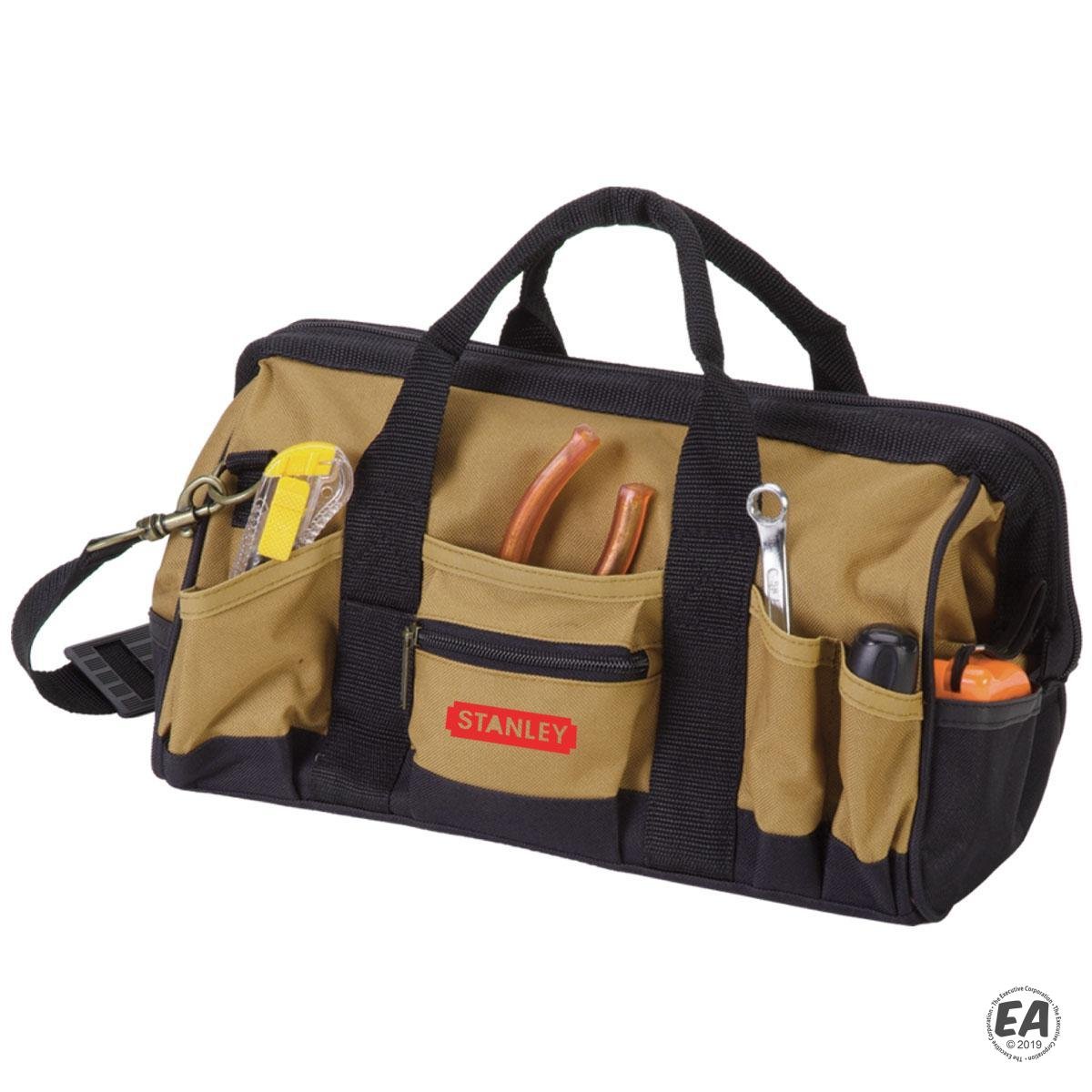 600D polyester. Zippered main compartment with metal frame. Numerous pockets and slots for tools on the front, back, and both sides. Detachable/adjustable padded shoulder strap. Reinforced webbed handles. Built-in cardboard bottom.
