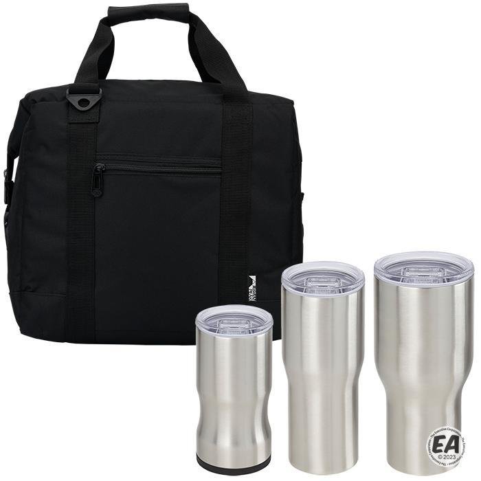 Includes the 12 oz 3-in-1 Insulator, 20 oz Vacuum Tumbler, 30 oz Vacuum Tumbler and the Cube 24 Can Cooler Bag
