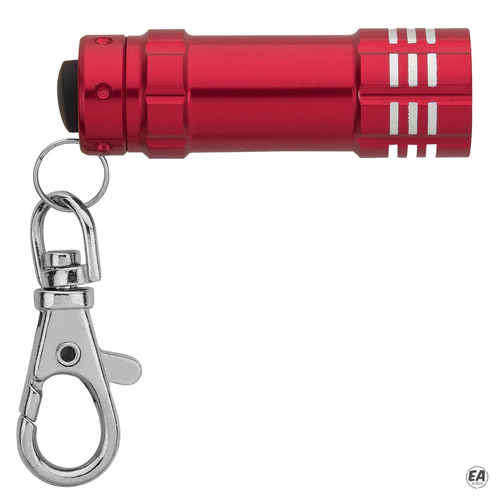 Aluminum 3-LED light with lobster clip and rubber push button on / off switch. Flashlight body approximately 2 5/16".
